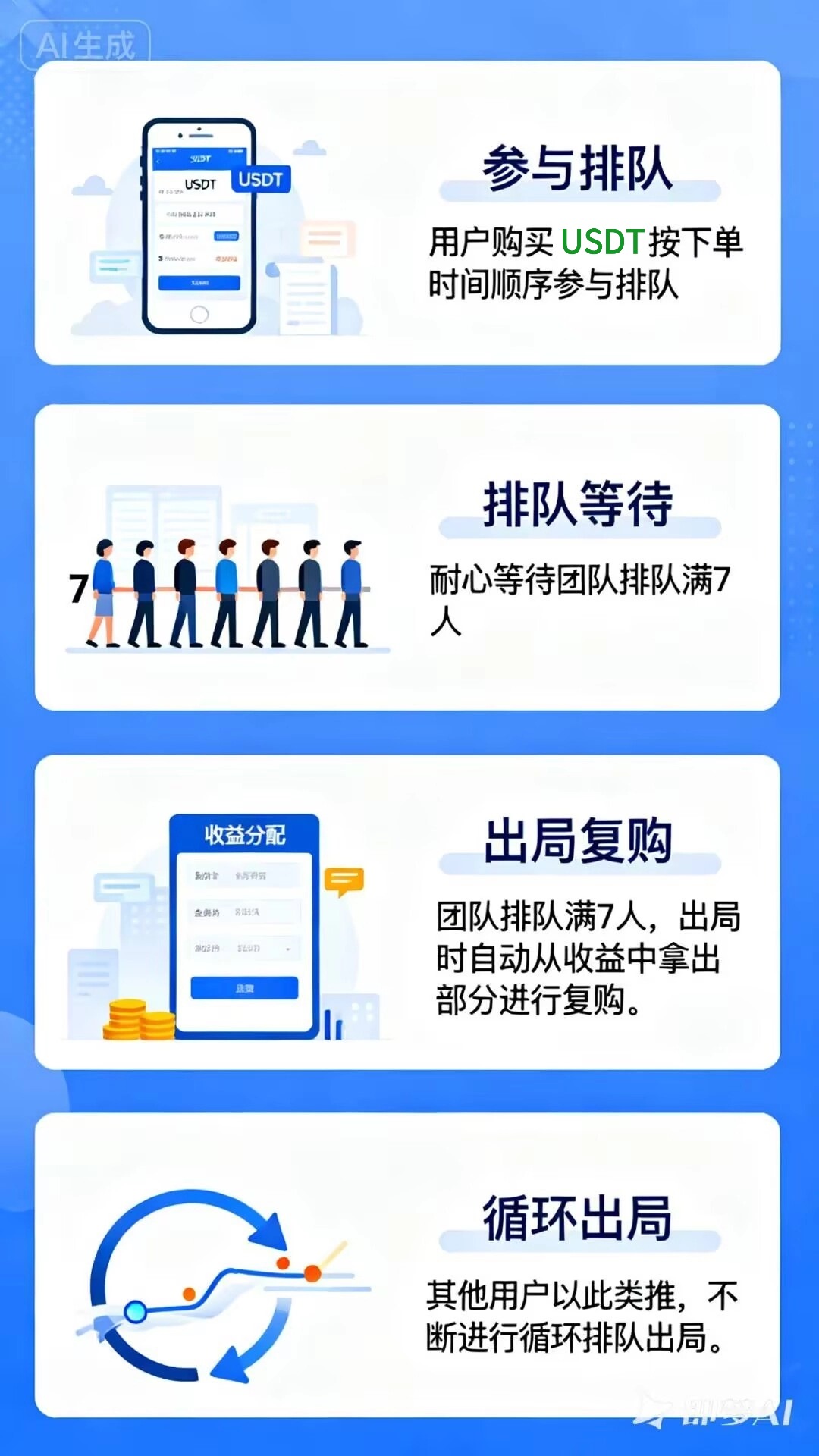 自动下单:获得分红的成员会自动出局并重新自动下单,重新进入推荐人的团队,推荐人再次获得50%的推荐奖励。这种循环机制让推荐人可以无限次获得奖励。